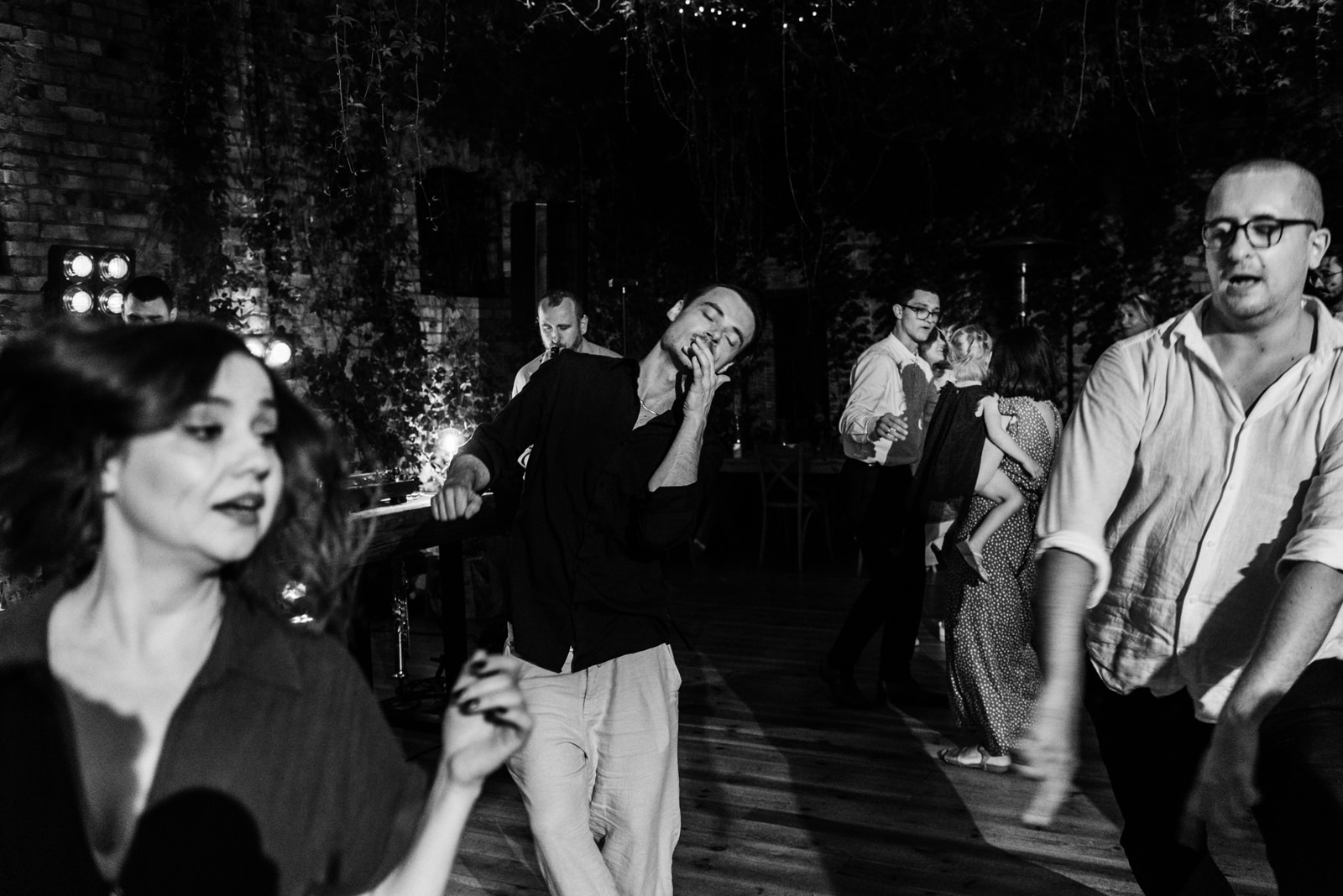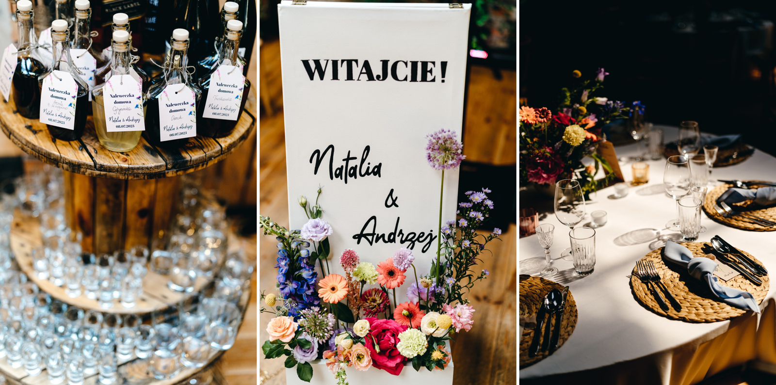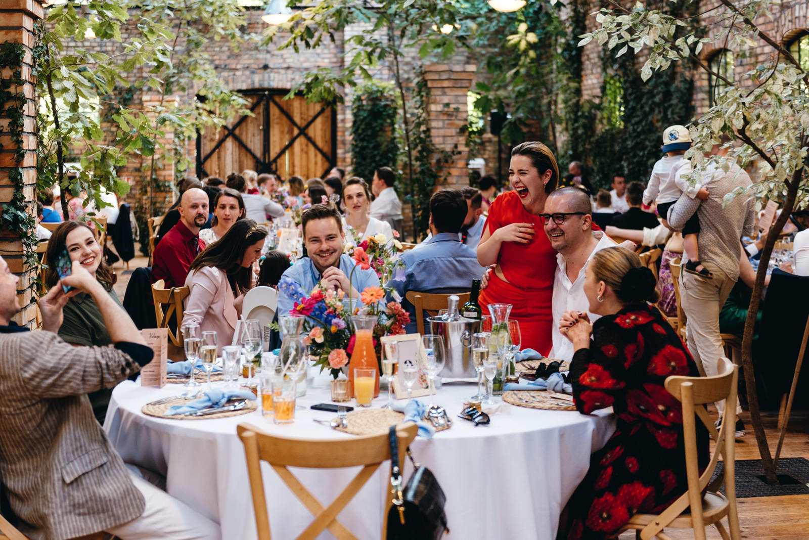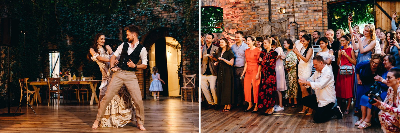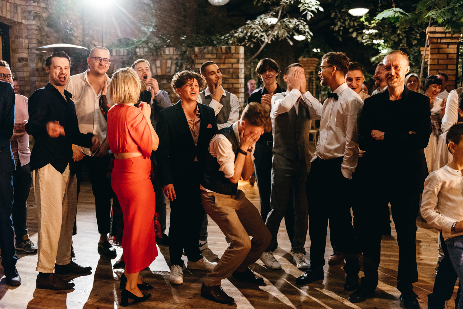 Wesele odbyło się w Dużej Stajni – czyli przestrzeni, która łączy klimat rustykalny z luzem typowym dla slow weddingów. Całość została przepięknie udekorowana przez Agatę z Floralmess – kolorowe kwiaty, lekko boho vibe i żadnej przesady. Tak to się robi! To nie była impreza z katalogu, tylko prawdziwe świętowanie – każdy element był „ich”. Ludzie czuli się swobodnie, a ja jako fotograf ślubny dokumentalny mogłem swobodnie łapać prawdziwe chwile – bez reżyserki, bez krzyku „spójrzcie tutaj”. Kiedy Andrzej zatańczył pierwszy taniec na bosaka, wiedziałem, że to nie będzie typowe wesele. I miałem rację.