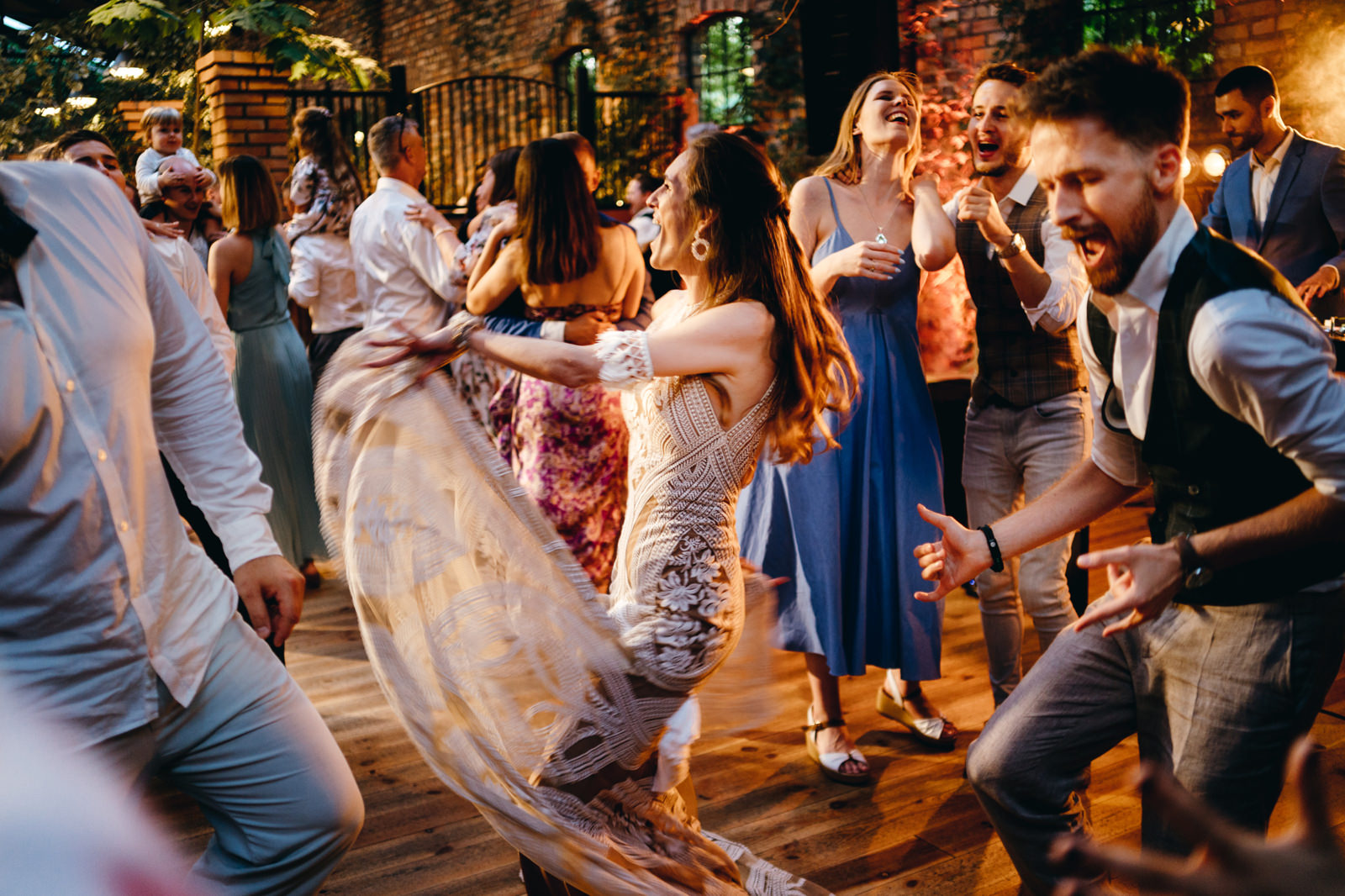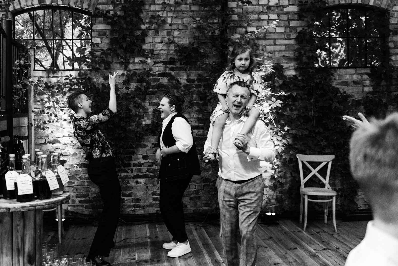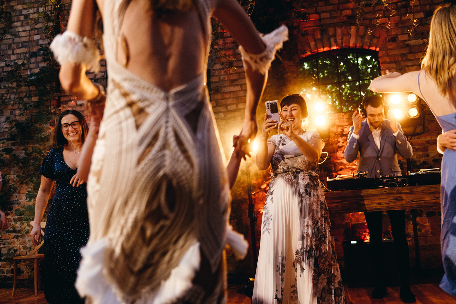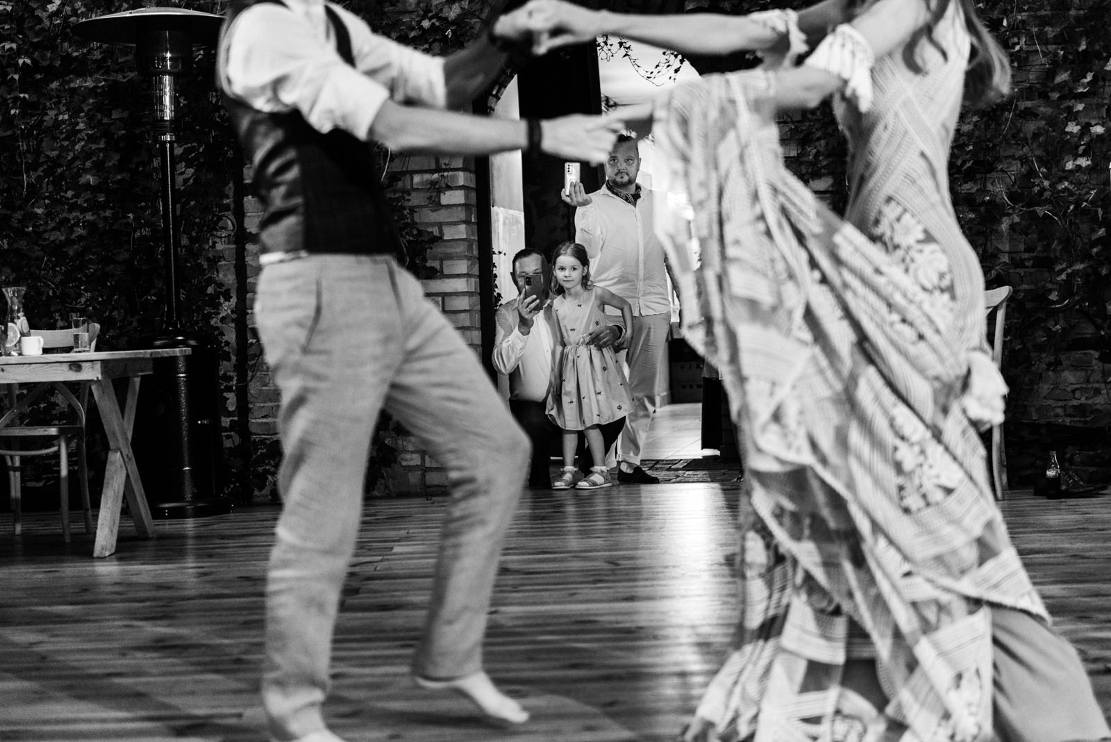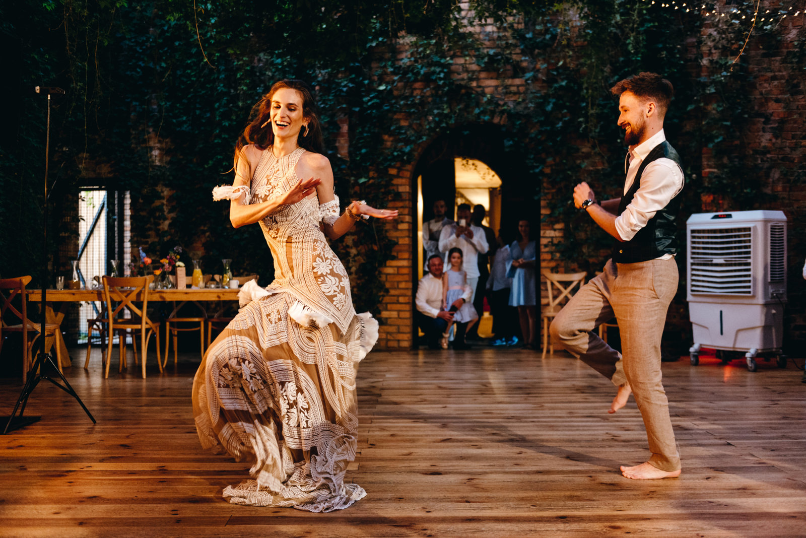 Wesele odbyło się w Dużej Stajni – czyli przestrzeni, która łączy klimat rustykalny z luzem typowym dla slow weddingów. Całość została przepięknie udekorowana przez Agatę z Floralmess – kolorowe kwiaty, lekko boho vibe i żadnej przesady. Tak to się robi! To nie była impreza z katalogu, tylko prawdziwe świętowanie – każdy element był „ich”. Ludzie czuli się swobodnie, a ja jako fotograf ślubny dokumentalny mogłem swobodnie łapać prawdziwe chwile – bez reżyserki, bez krzyku „spójrzcie tutaj”. Kiedy Andrzej zatańczył pierwszy taniec na bosaka, wiedziałem, że to nie będzie typowe wesele. I miałem rację.