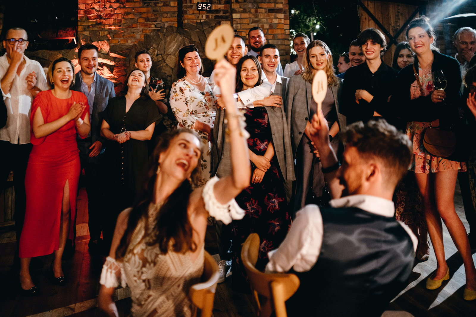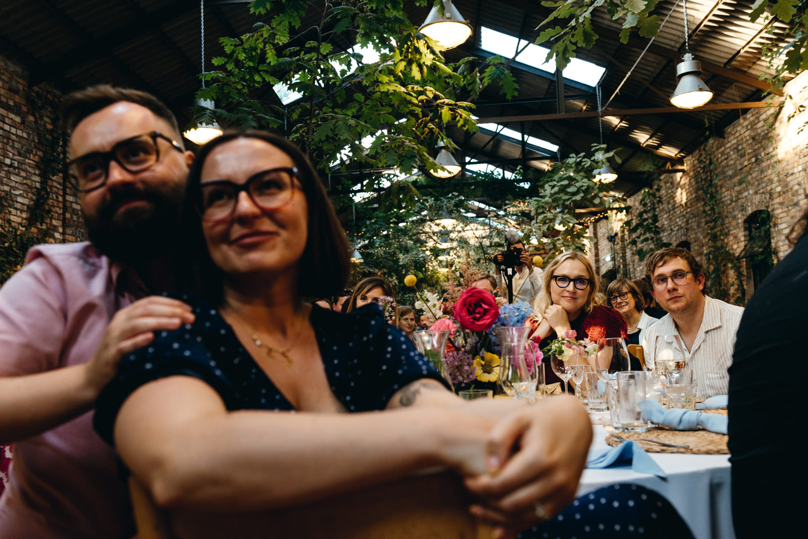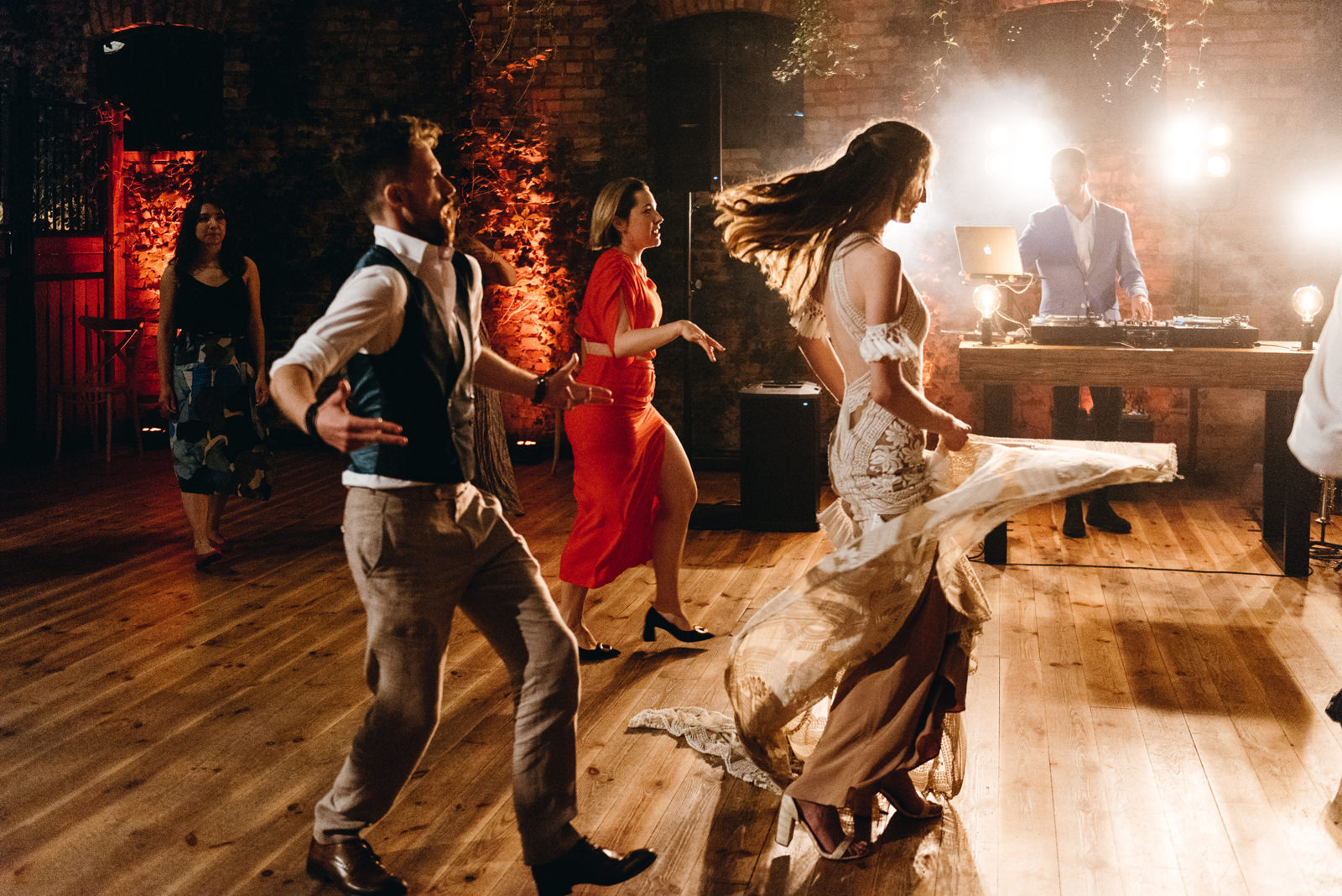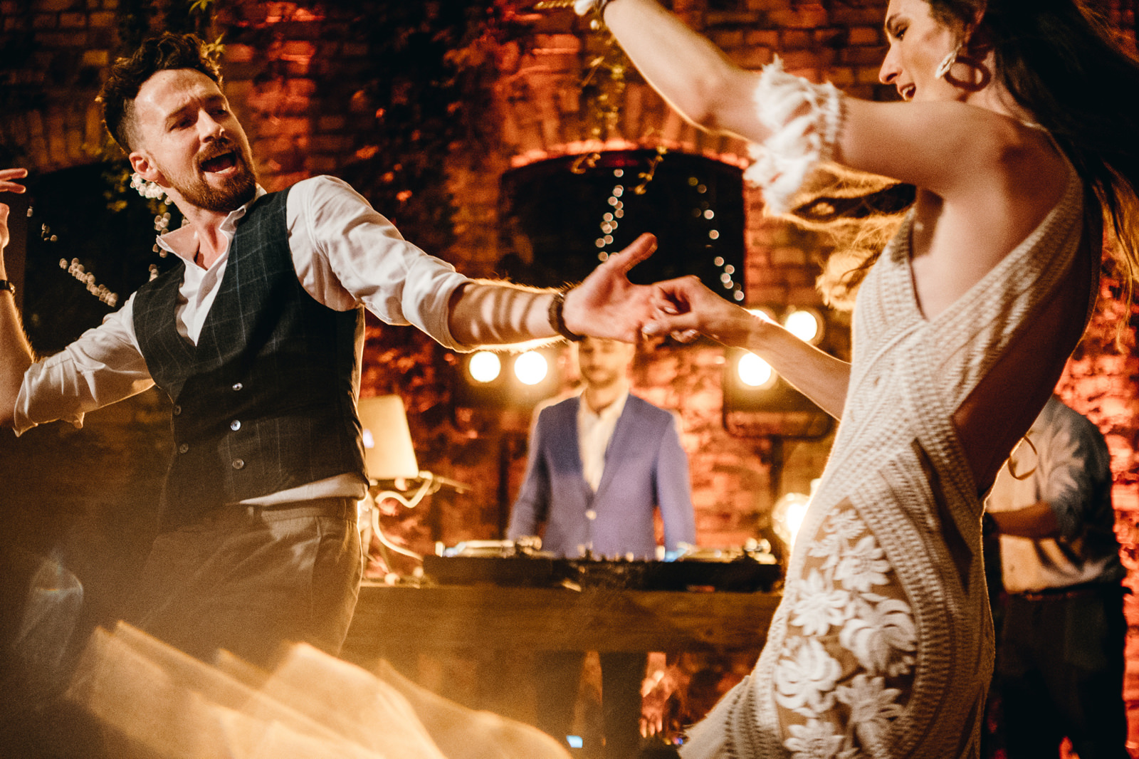 Wesele odbyło się w Dużej Stajni – czyli przestrzeni, która łączy klimat rustykalny z luzem typowym dla slow weddingów. Całość została przepięknie udekorowana przez Agatę z Floralmess – kolorowe kwiaty, lekko boho vibe i żadnej przesady. Tak to się robi! To nie była impreza z katalogu, tylko prawdziwe świętowanie – każdy element był „ich”. Ludzie czuli się swobodnie, a ja jako fotograf ślubny dokumentalny mogłem swobodnie łapać prawdziwe chwile – bez reżyserki, bez krzyku „spójrzcie tutaj”. Kiedy Andrzej zatańczył pierwszy taniec na bosaka, wiedziałem, że to nie będzie typowe wesele. I miałem rację.
