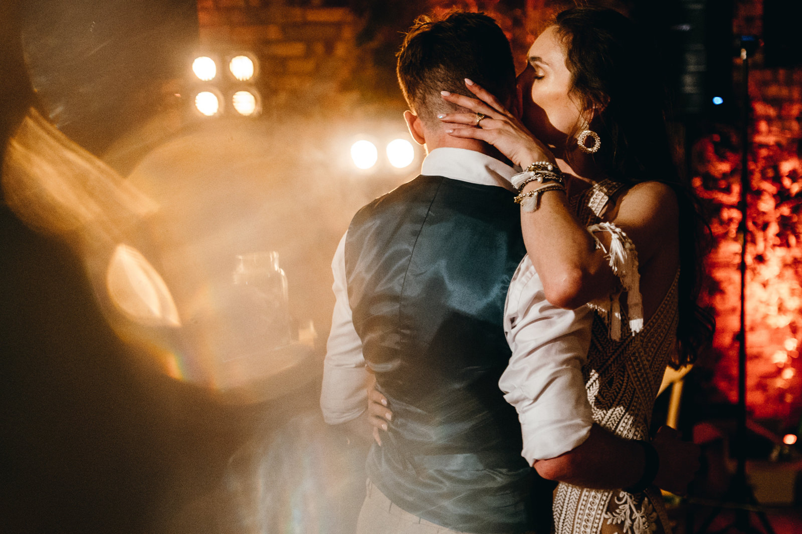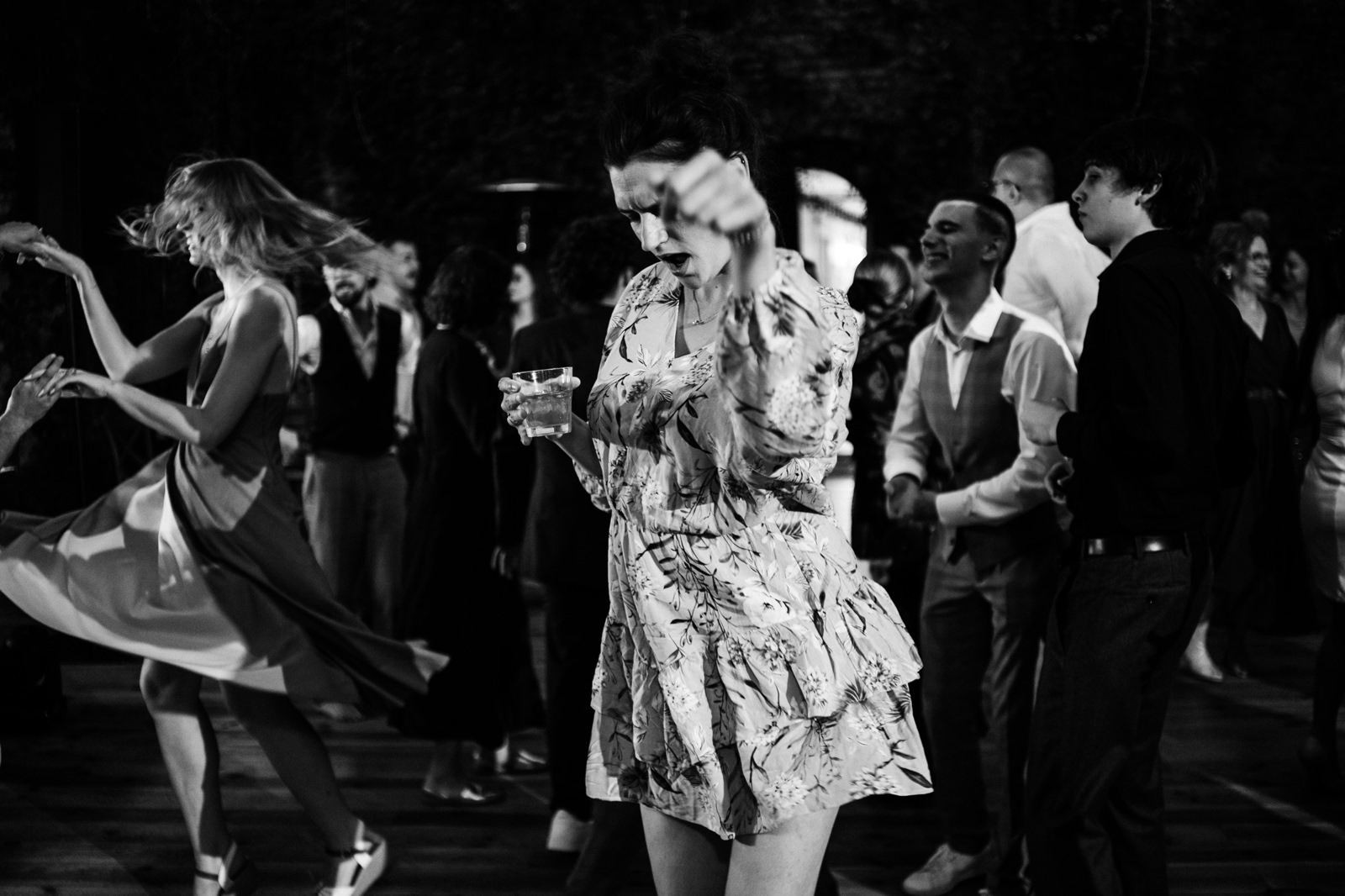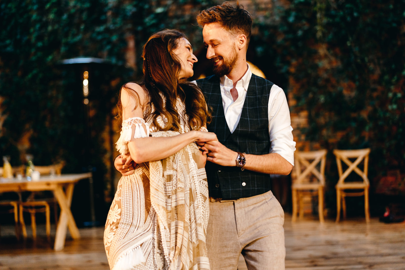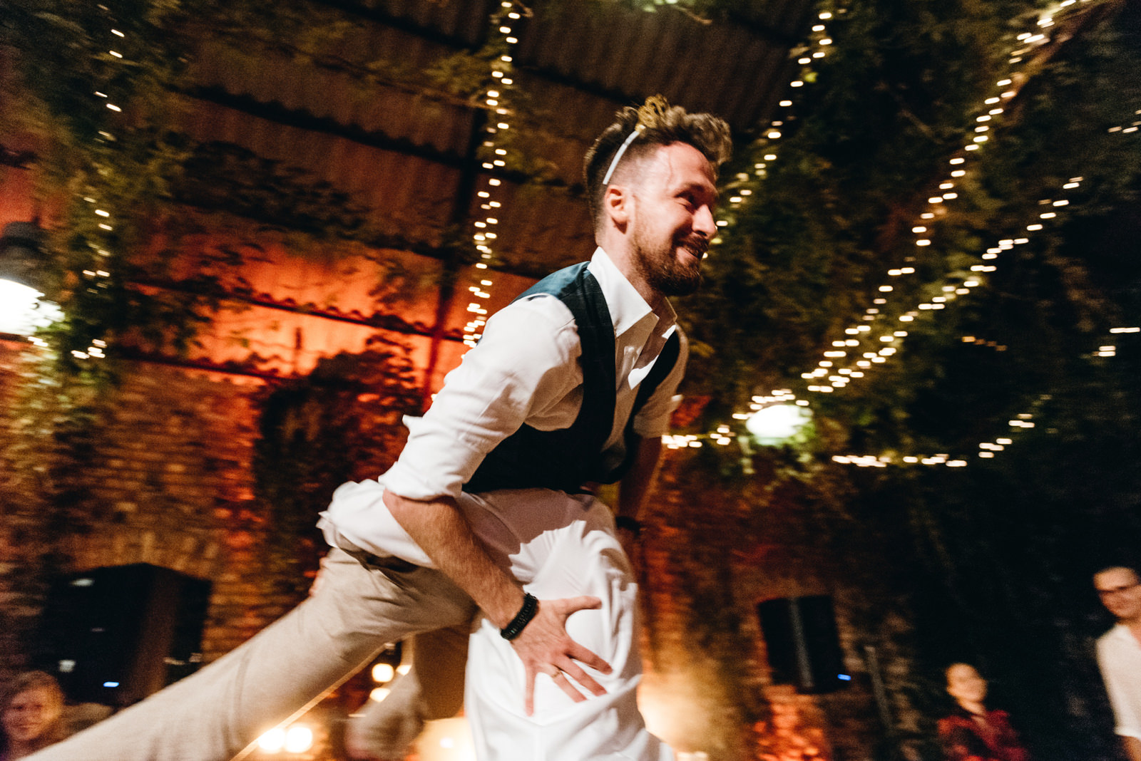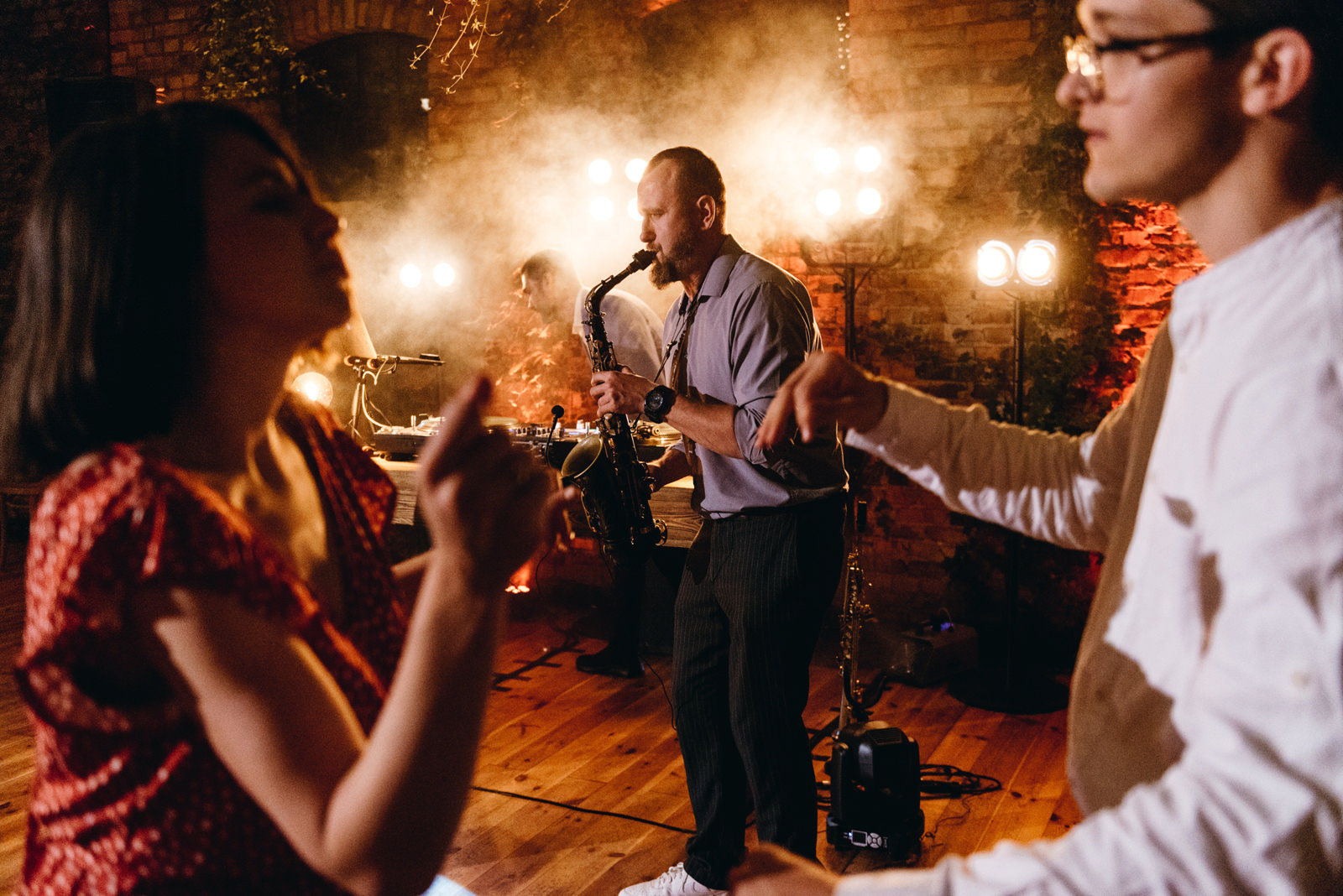 Wesele odbyło się w Dużej Stajni – czyli przestrzeni, która łączy klimat rustykalny z luzem typowym dla slow weddingów. Całość została przepięknie udekorowana przez Agatę z Floralmess – kolorowe kwiaty, lekko boho vibe i żadnej przesady. Tak to się robi! To nie była impreza z katalogu, tylko prawdziwe świętowanie – każdy element był „ich”. Ludzie czuli się swobodnie, a ja jako fotograf ślubny dokumentalny mogłem swobodnie łapać prawdziwe chwile – bez reżyserki, bez krzyku „spójrzcie tutaj”. Kiedy Andrzej zatańczył pierwszy taniec na bosaka, wiedziałem, że to nie będzie typowe wesele. I miałem rację.
