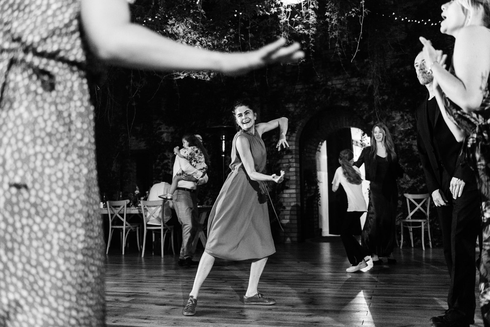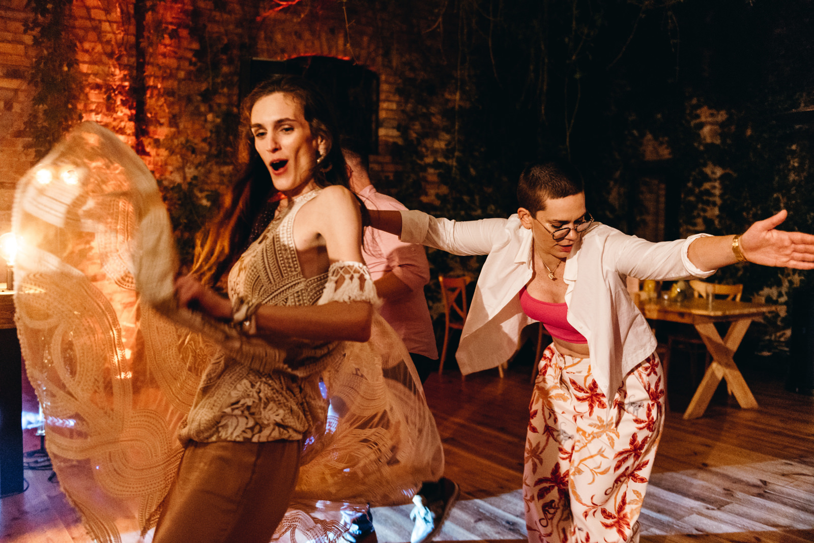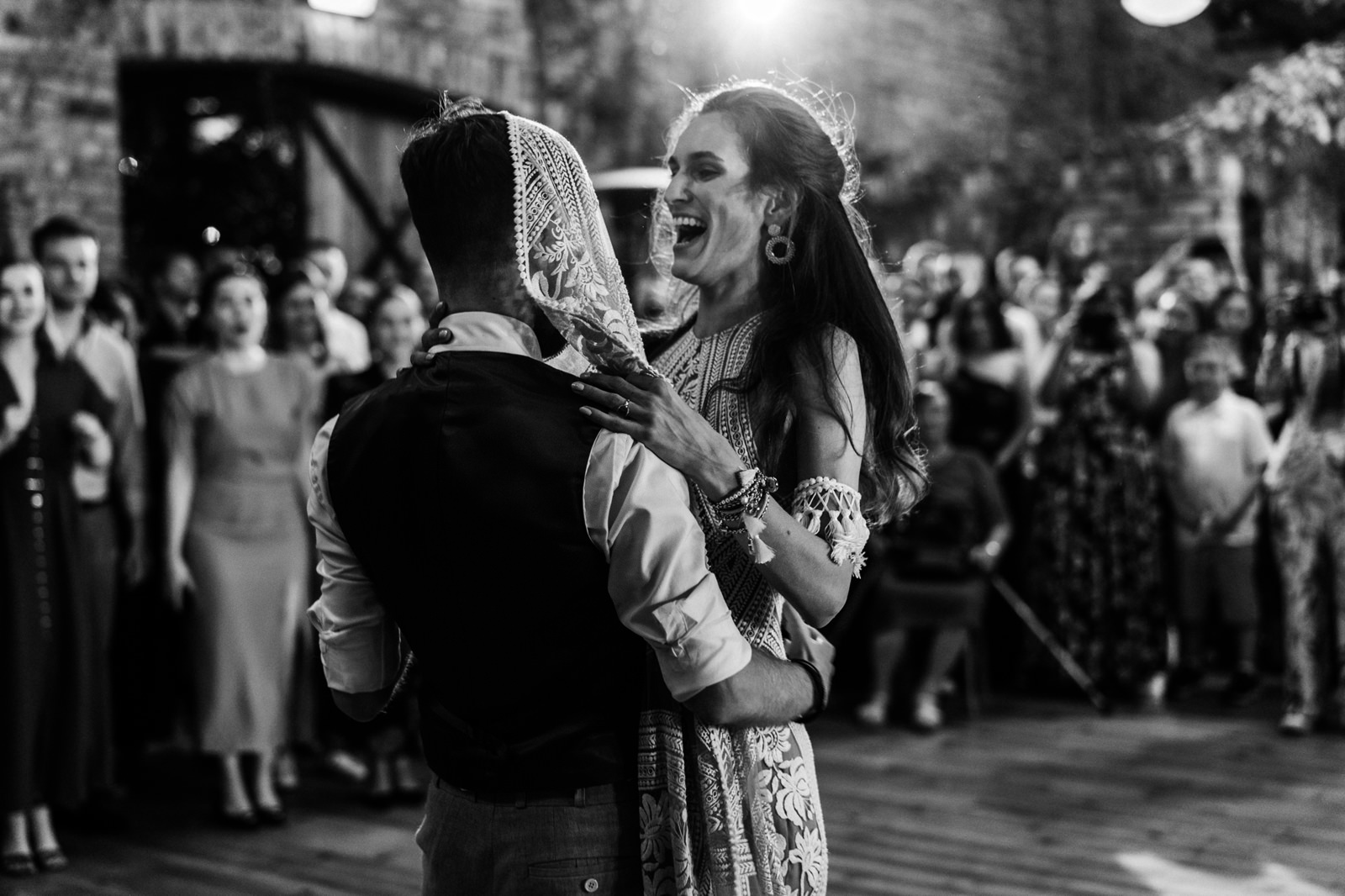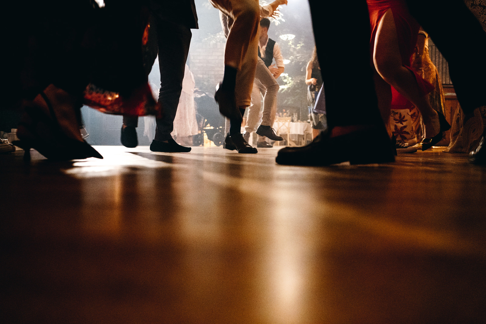 Wesele odbyło się w Dużej Stajni – czyli przestrzeni, która łączy klimat rustykalny z luzem typowym dla slow weddingów. Całość została przepięknie udekorowana przez Agatę z Floralmess – kolorowe kwiaty, lekko boho vibe i żadnej przesady. Tak to się robi! To nie była impreza z katalogu, tylko prawdziwe świętowanie – każdy element był „ich”. Ludzie czuli się swobodnie, a ja jako fotograf ślubny dokumentalny mogłem swobodnie łapać prawdziwe chwile – bez reżyserki, bez krzyku „spójrzcie tutaj”. Kiedy Andrzej zatańczył pierwszy taniec na bosaka, wiedziałem, że to nie będzie typowe wesele. I miałem rację.