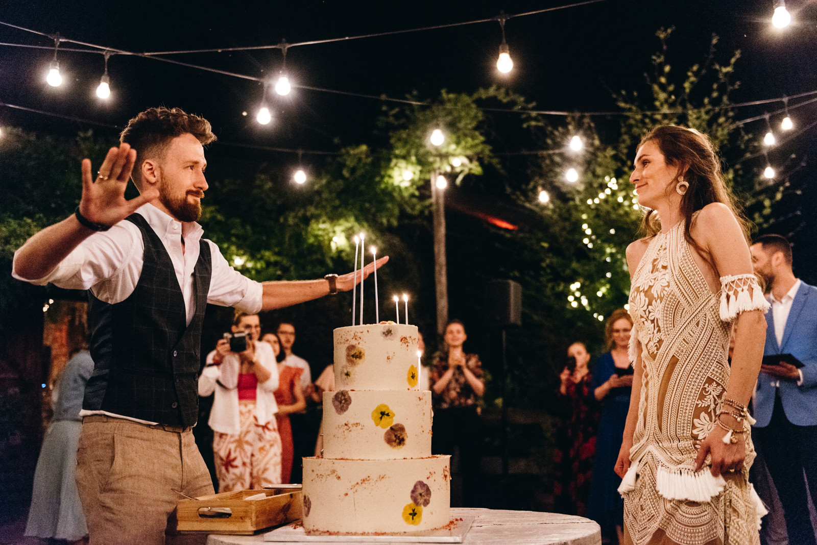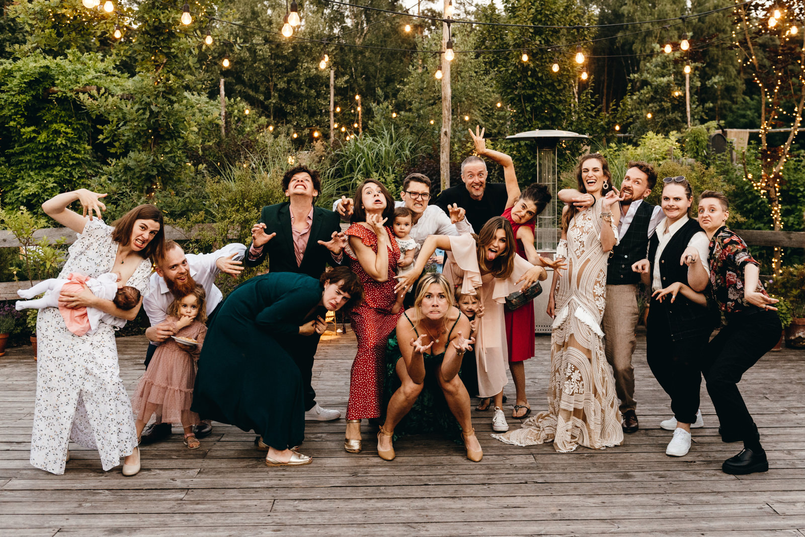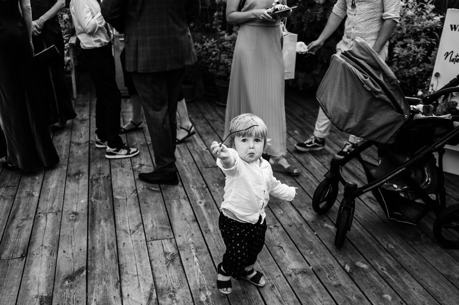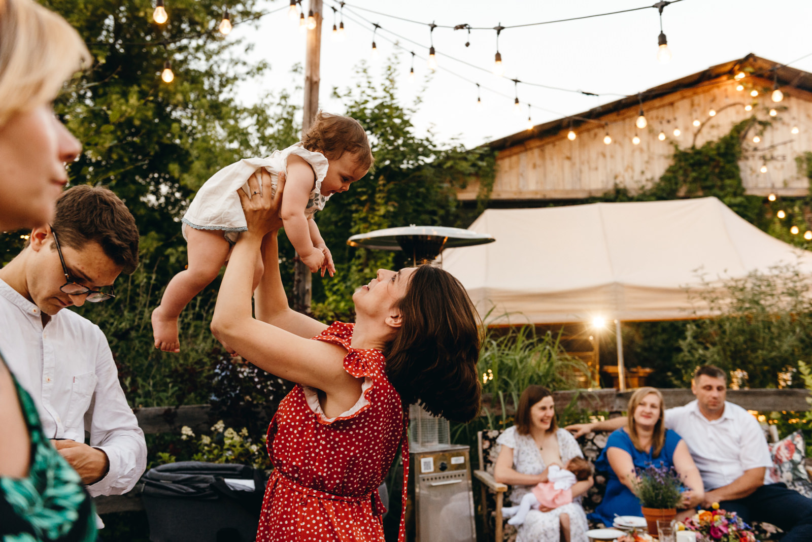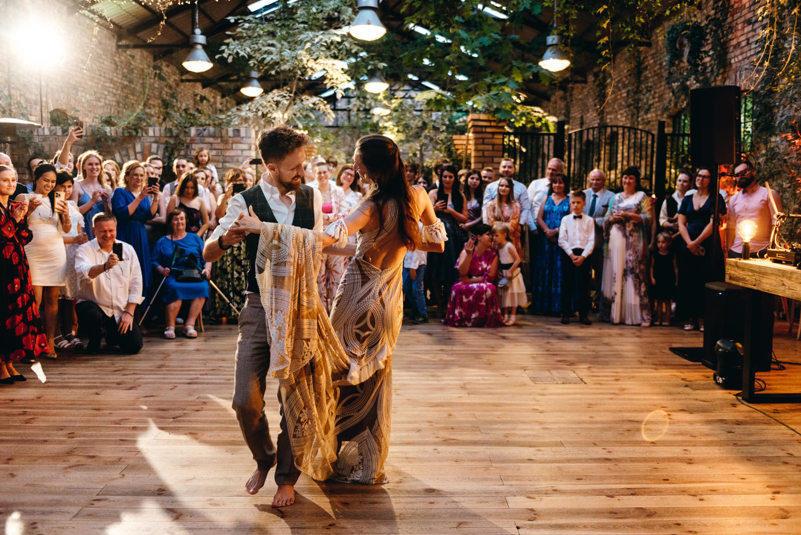 Wesele odbyło się w Dużej Stajni – czyli przestrzeni, która łączy klimat rustykalny z luzem typowym dla slow weddingów. Całość została przepięknie udekorowana przez Agatę z Floralmess – kolorowe kwiaty, lekko boho vibe i żadnej przesady. Tak to się robi! To nie była impreza z katalogu, tylko prawdziwe świętowanie – każdy element był „ich”. Ludzie czuli się swobodnie, a ja jako fotograf ślubny dokumentalny mogłem swobodnie łapać prawdziwe chwile – bez reżyserki, bez krzyku „spójrzcie tutaj”. Kiedy Andrzej zatańczył pierwszy taniec na bosaka, wiedziałem, że to nie będzie typowe wesele. I miałem rację.