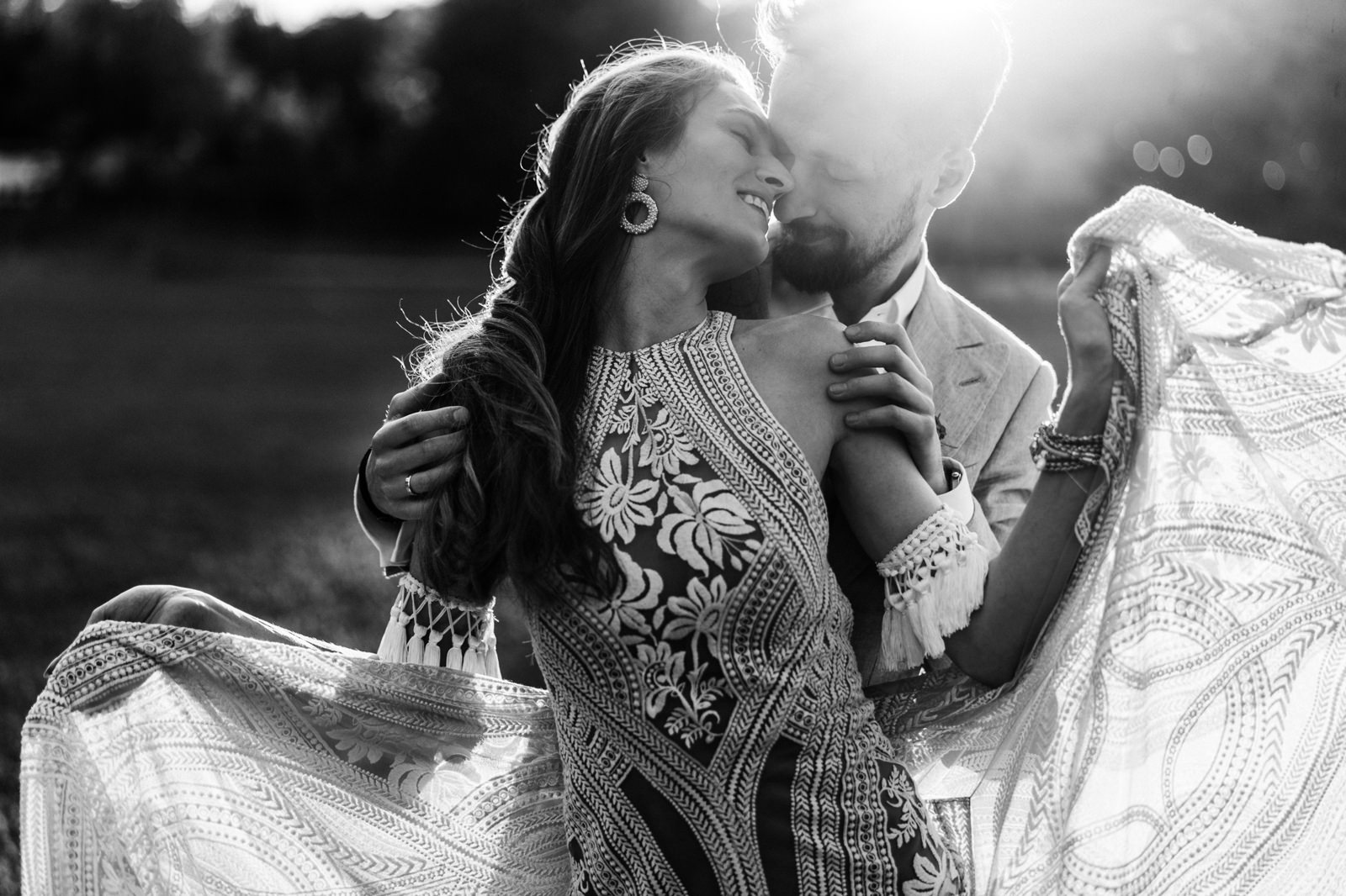 Natalia i Andrzej to para, z którą od razu wiadomo, że będzie dobrze. Mają psa rasy Samoyed – białego jak śmietanka do lodów i równie słodkiego – który nie tylko pięknie pozował, ale też kradł show lepiej niż niejeden drużba. Podczas krótkiej sesji złapaliśmy kilka wspólnych kadrów, które totalnie oddają ich energię. Ich zdjęcia ślubne to esencja tego, co kocham w pracy fotografa – dokumentalny styl, bez ciśnienia i zbędnych instrukcji. A suknia Natalii od Rue De Seine? Czyste boho, które genialnie zagrało w naturalnej przestrzeni Cichej23. Fotograf ślubny Warszawa to hasło, pod którym działam, ale jeśli mogę wyjechać za miasto i robić zdjęcia w takim miejscu jak stodoła na wesele blisko Warszawy, to pakuję sprzęt bez mrugnięcia okiem.